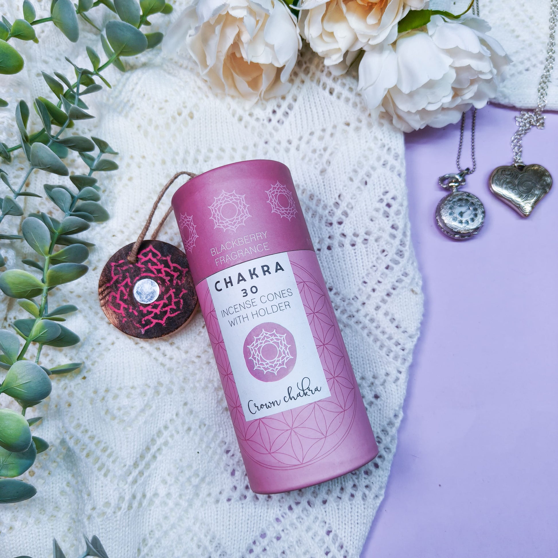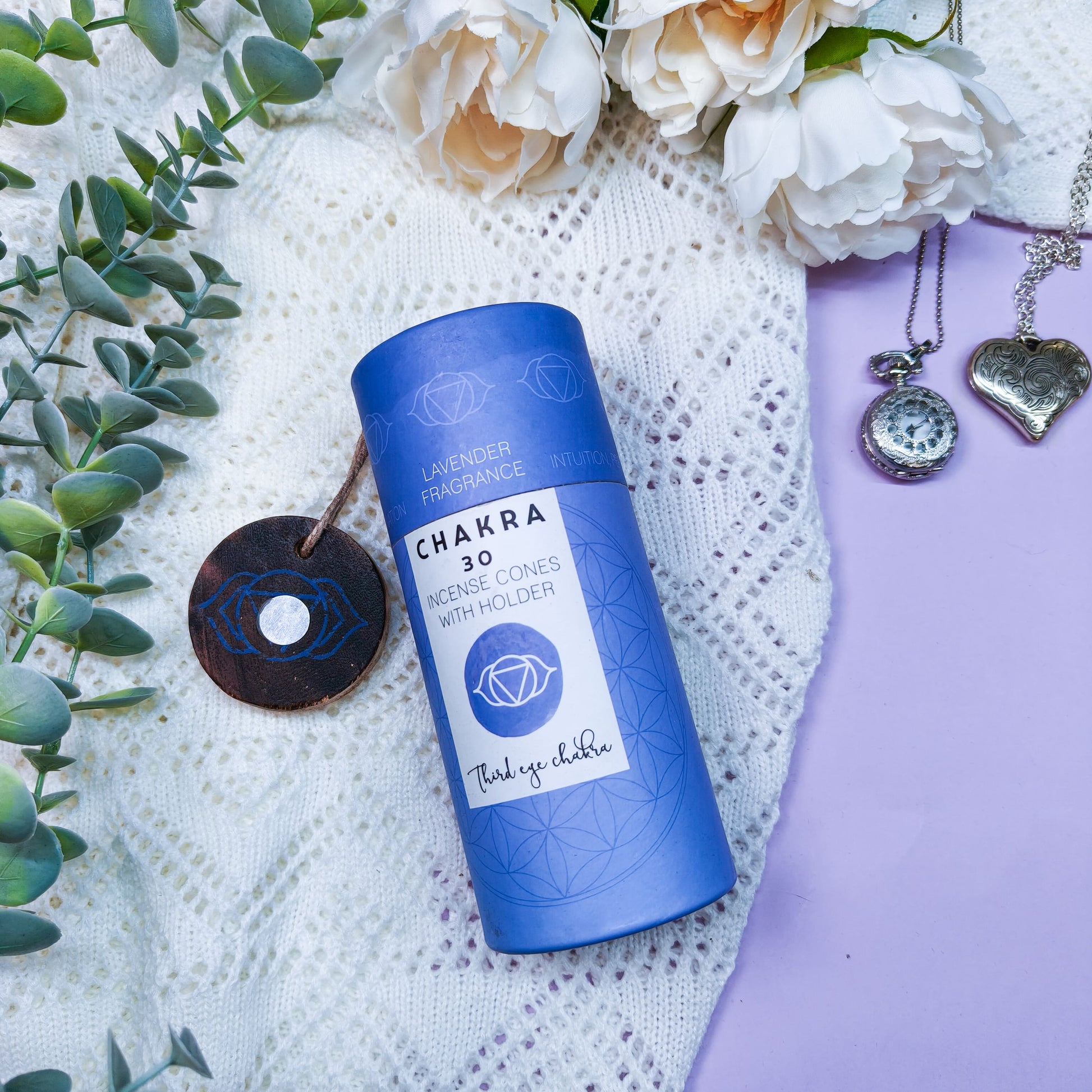 Suitsukkeet jokaiselle chakralle! Yksi pakkaus sisältää 30 suitsukekartiota sekä puisen suitsuketelineen.