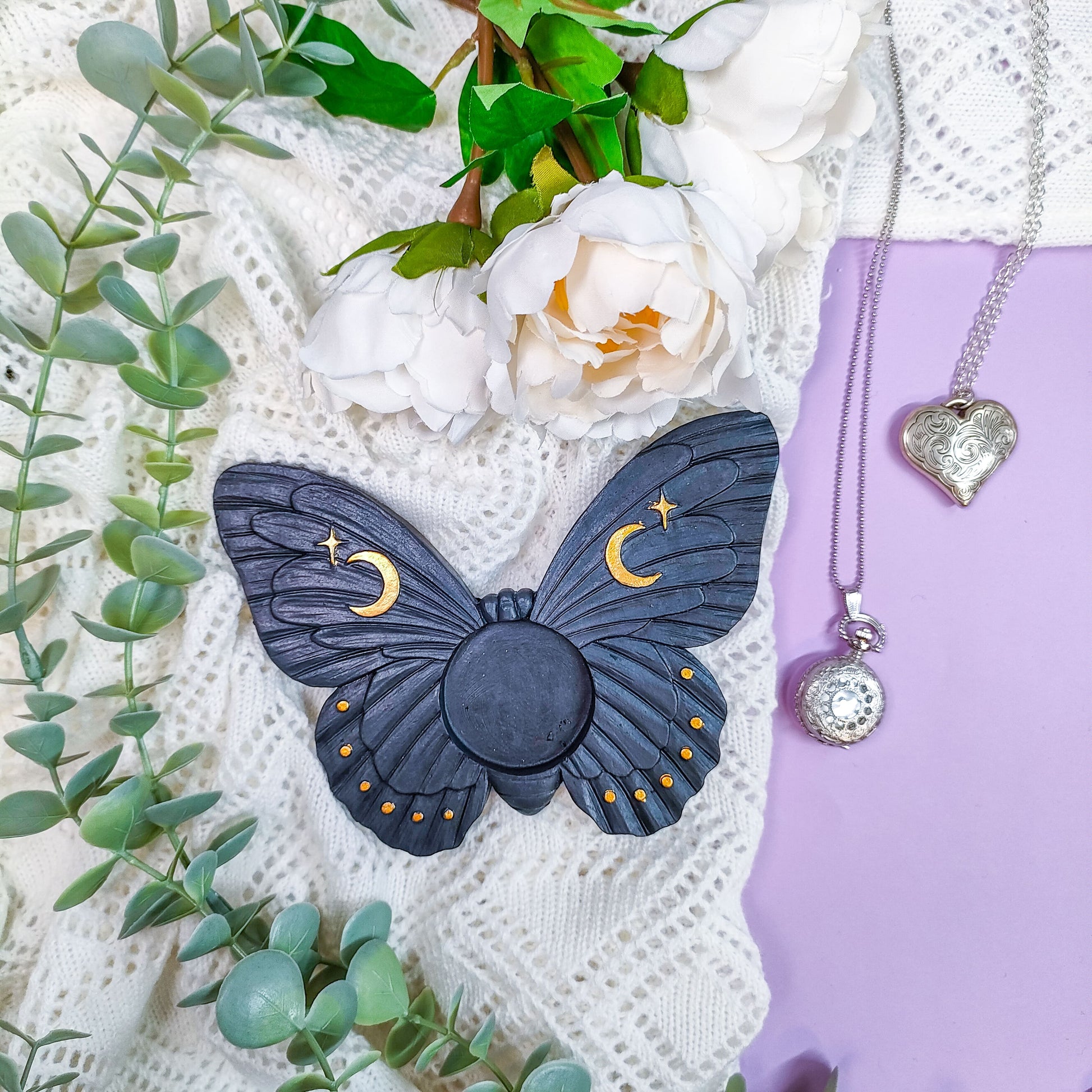 Yöperhosen muotoinen kynttiläteline tuikkukynttilöille.