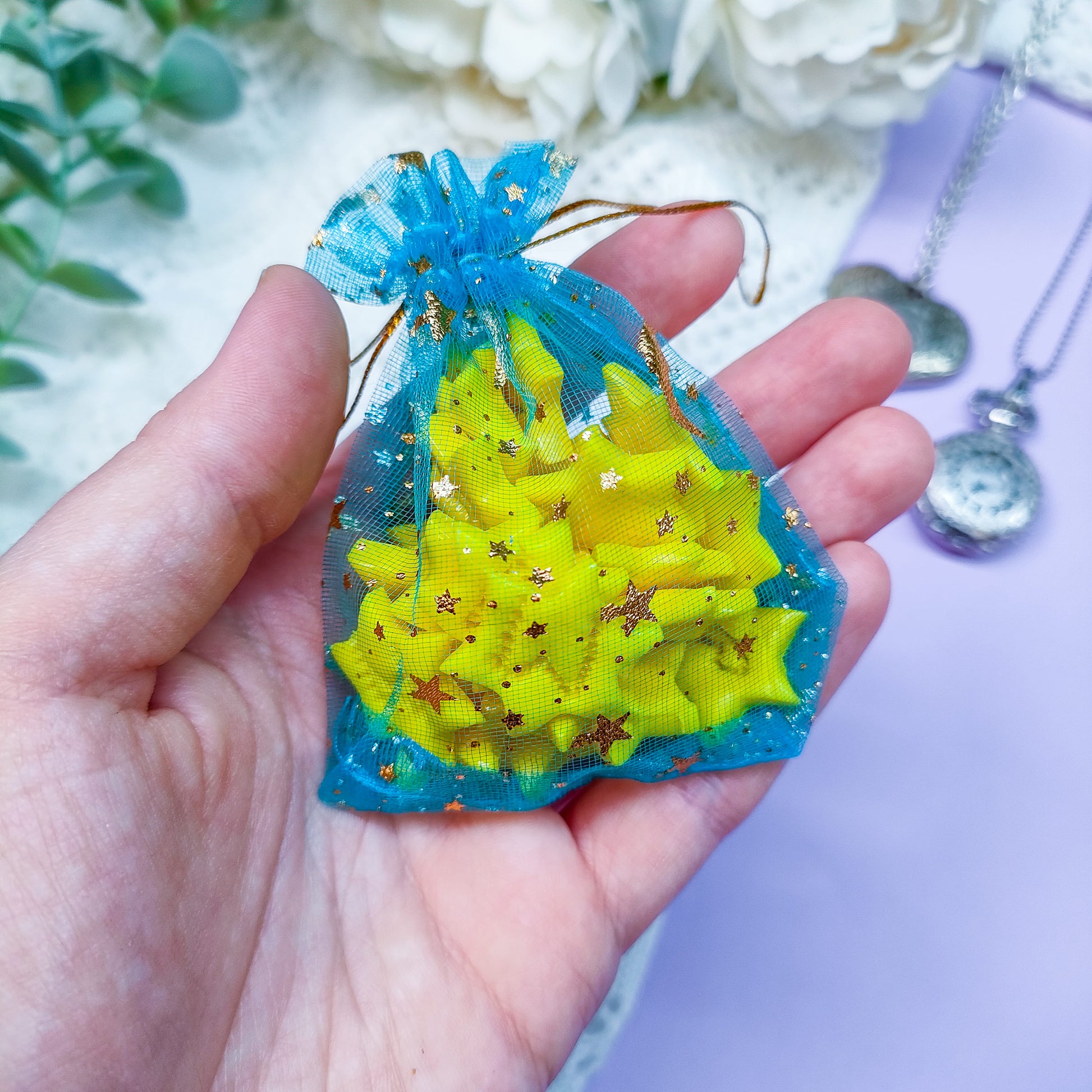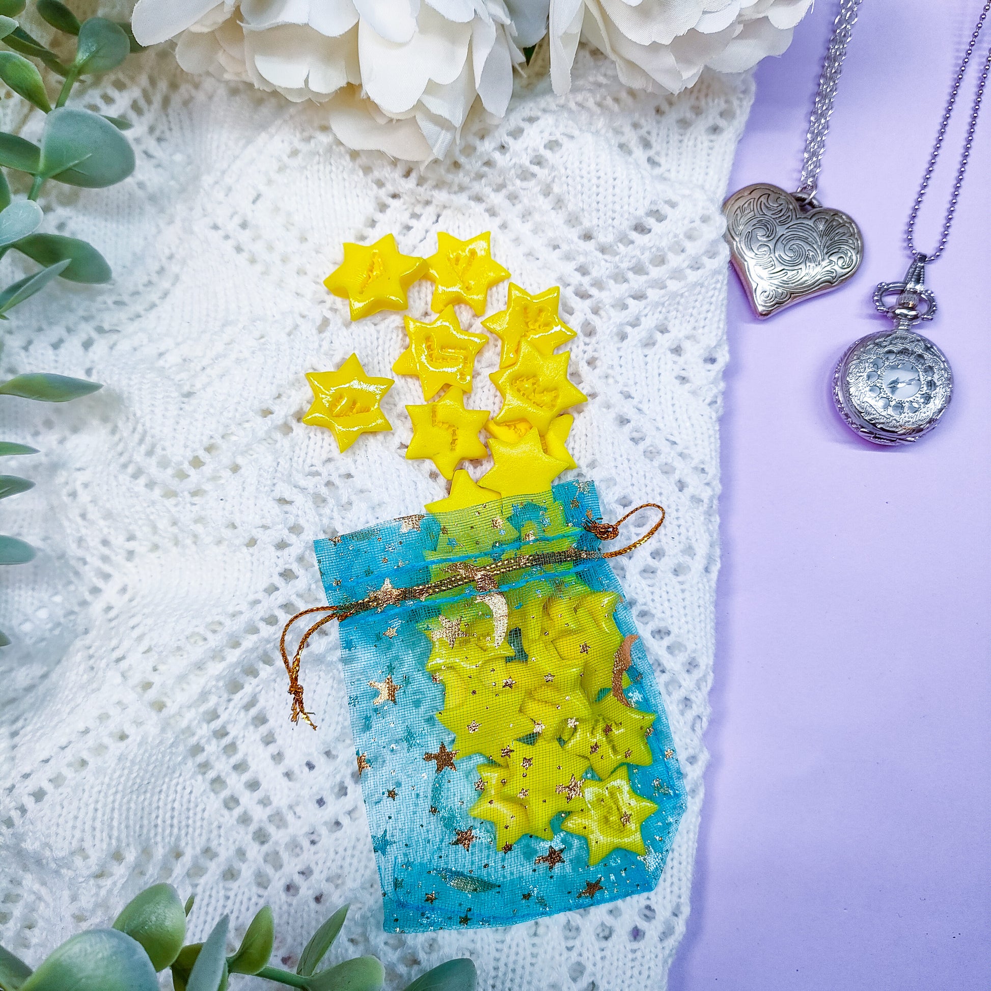 ♥ Keltaiset tähden muotoiset riimut sinisessä pussissa, riimusymbolit kaiverrettu massaan.