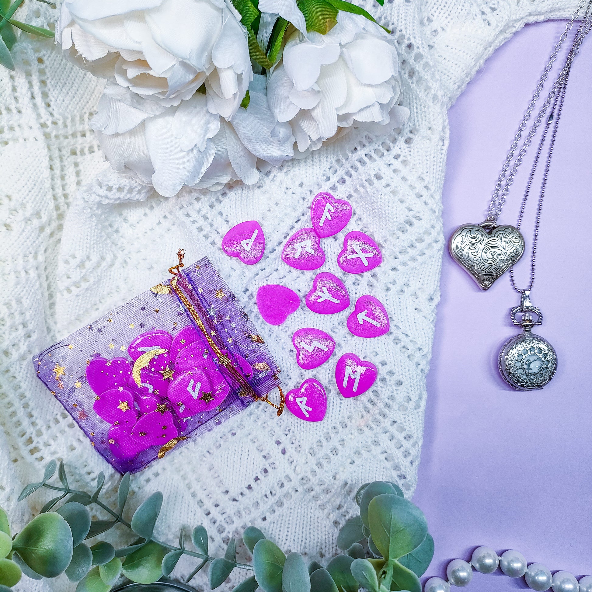 ♥ Tummanpinkit sydämen muotoiset riimut lilassa pussissa, riimusymbolit valkoisella tussilla.
