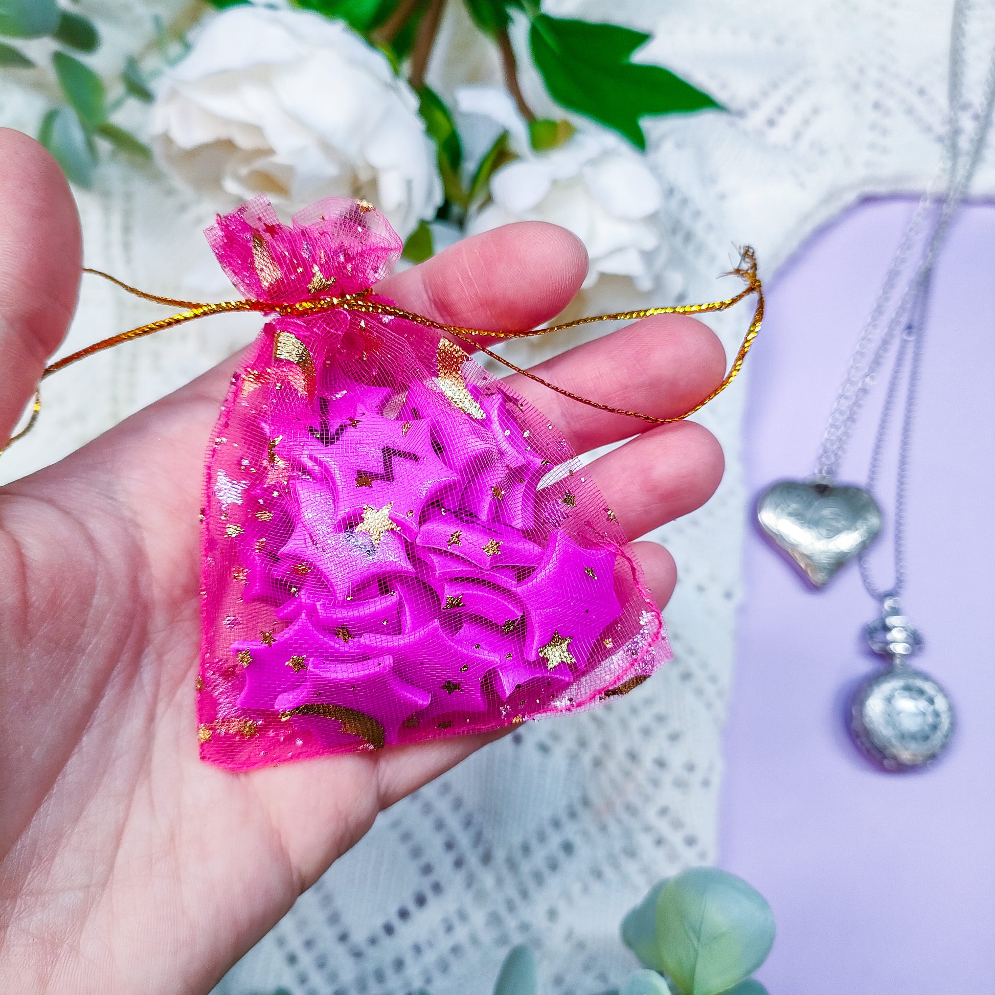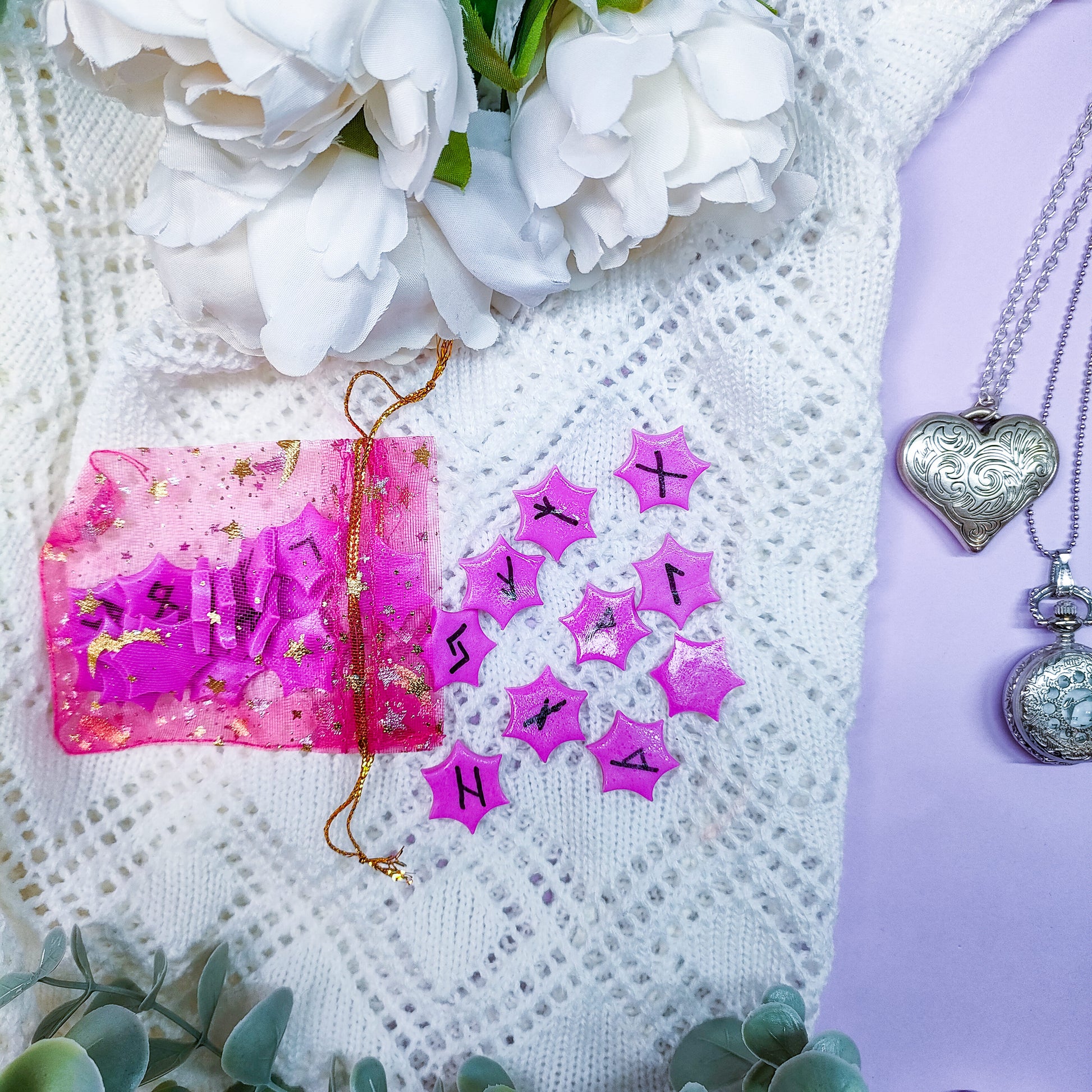 ♥ Tummanpinkit tähden muotoiset riimut pinkissä pussissa, riimusymbolit mustalla tussilla.