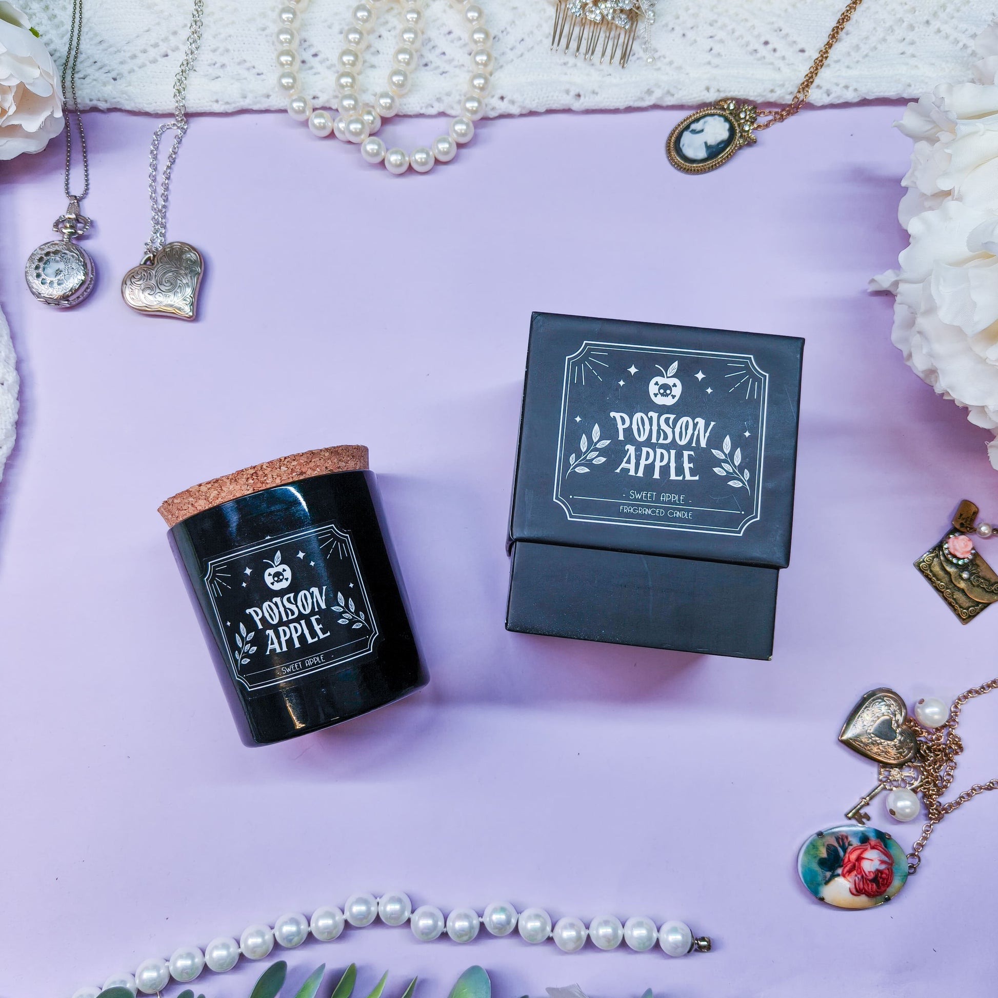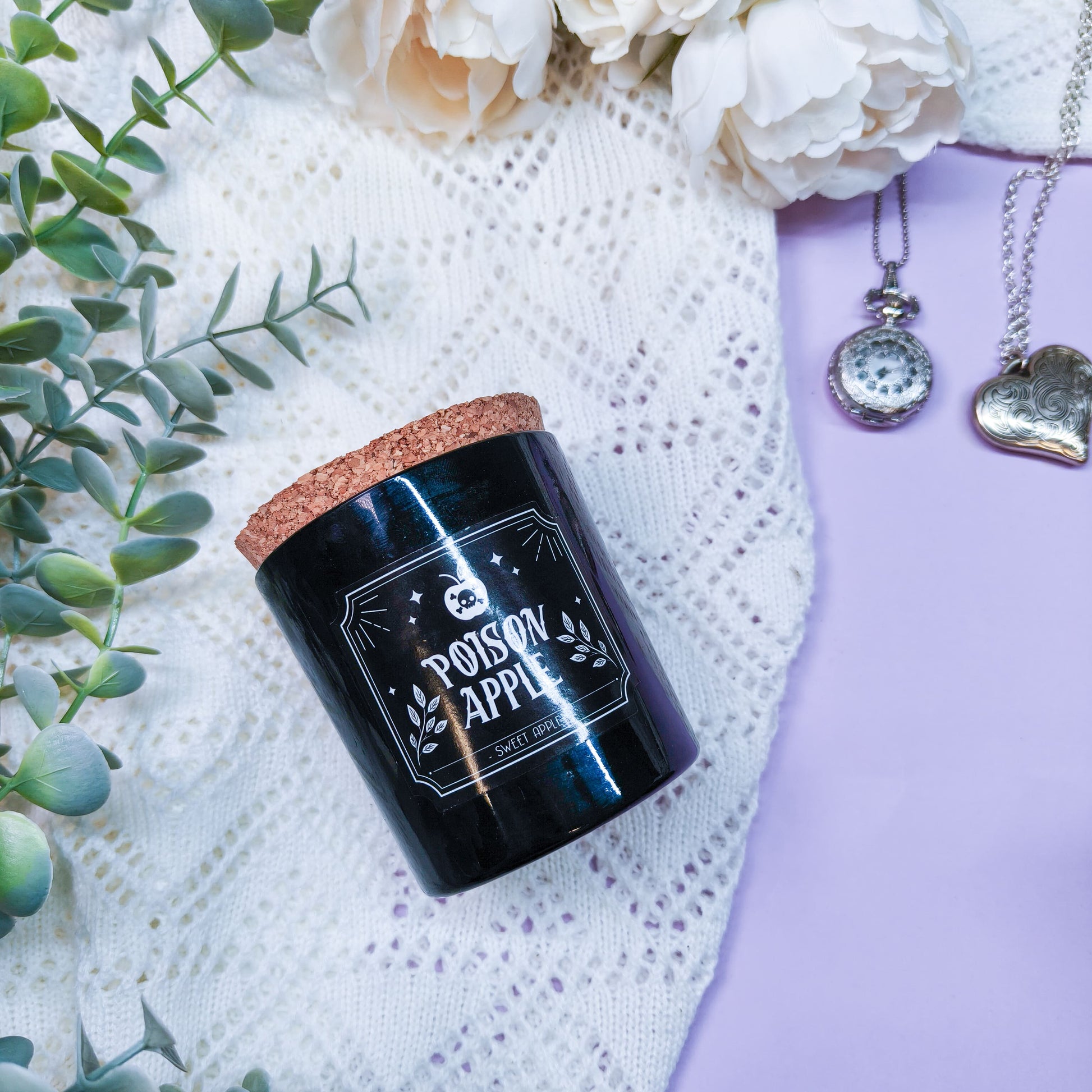 Omenan tuoksuinen valkoinen kynttilä mustassa astiassa. Sisältää korkkipuisen kannen, jotta tuoksu säilyy käyttöjen välissä.