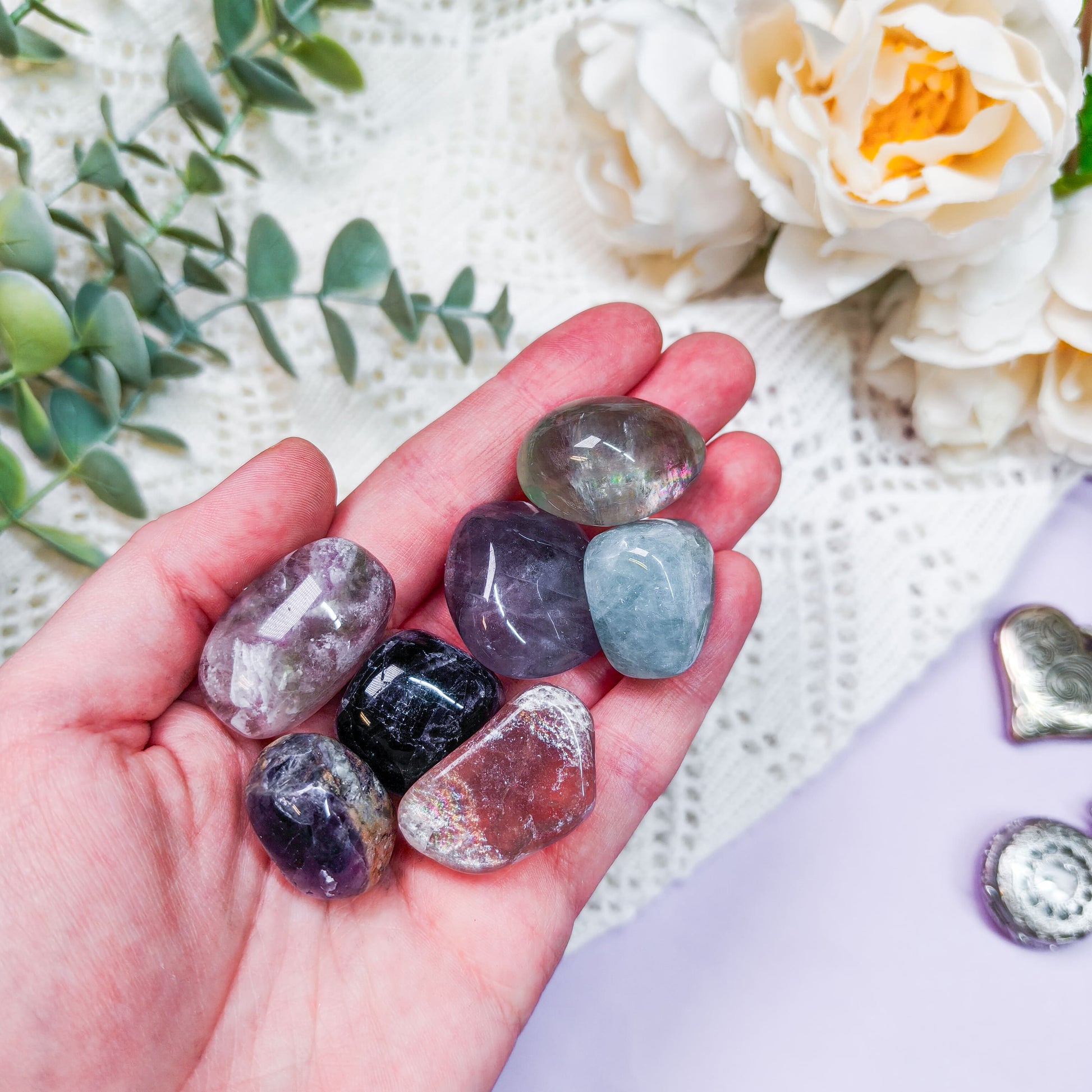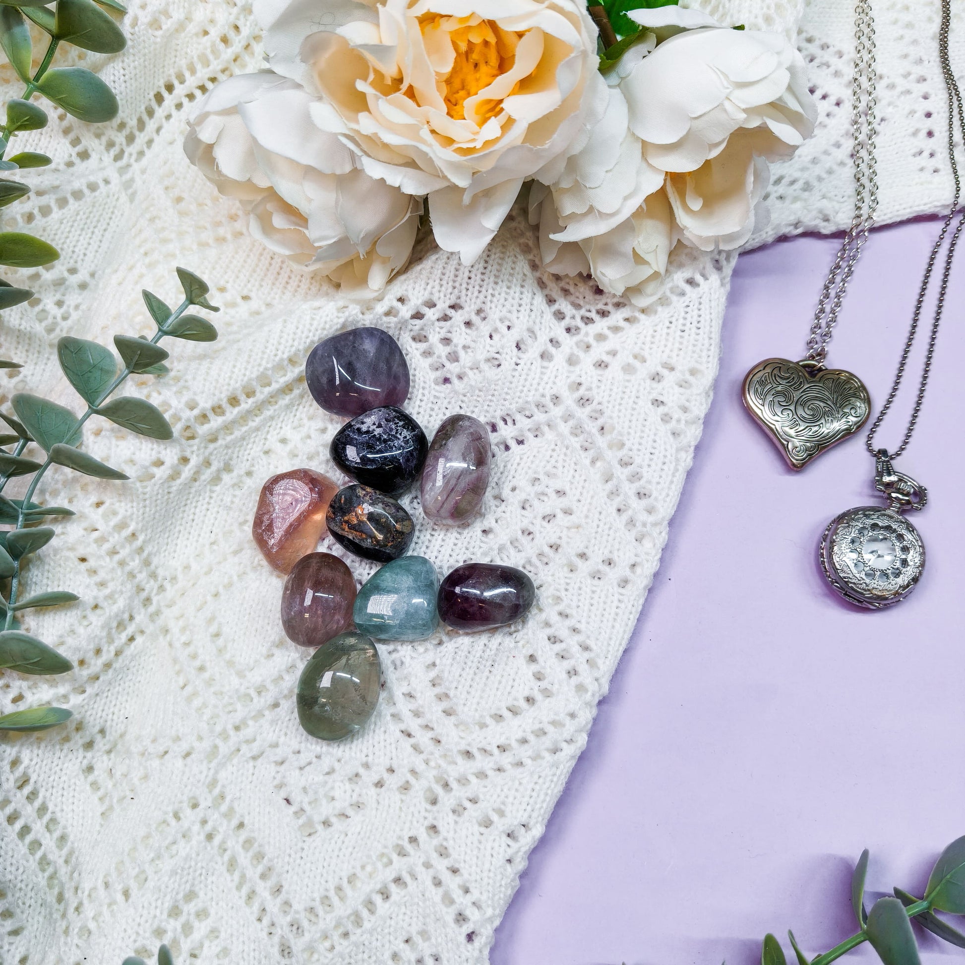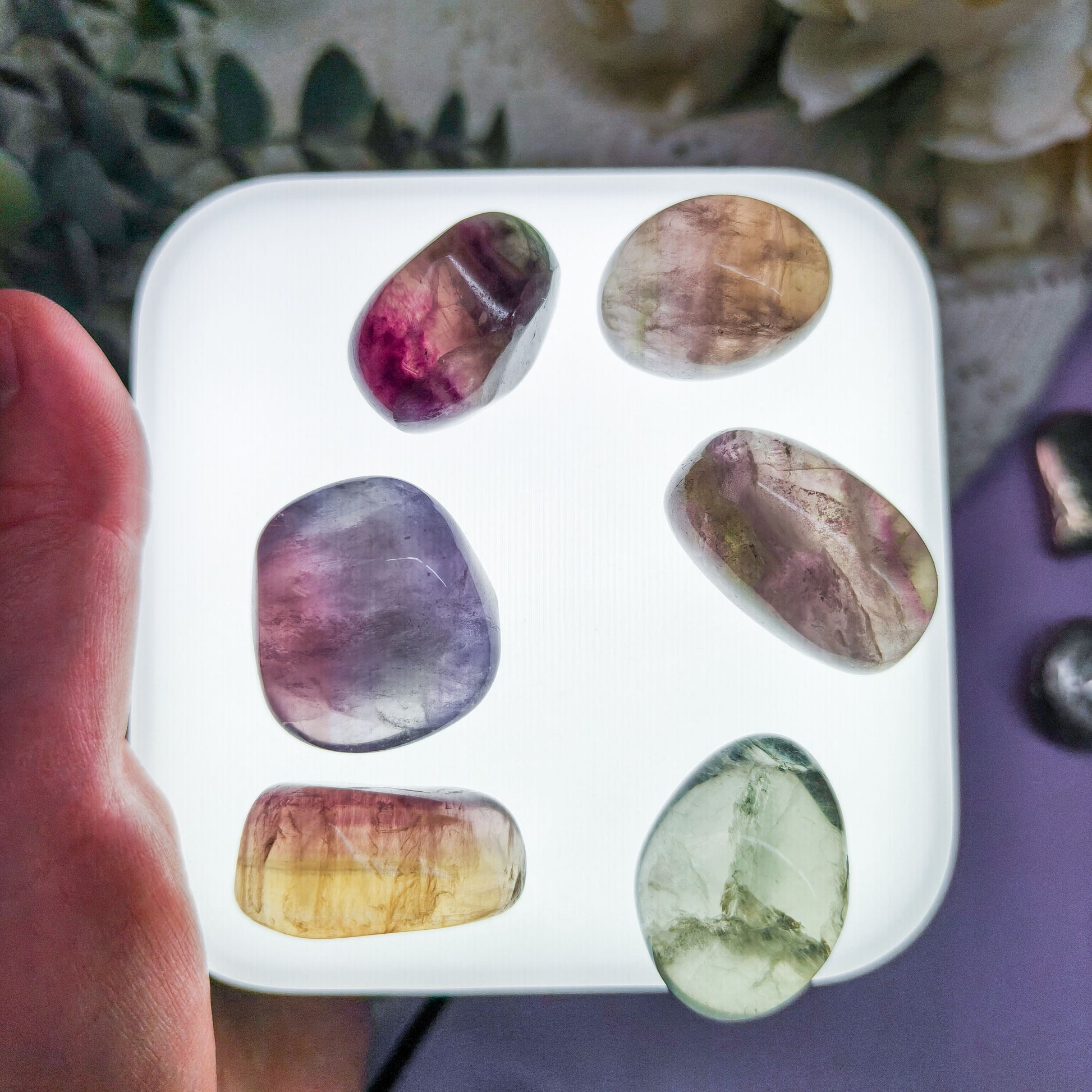 Avainsanat: fluoriitti, vihreä, lila, violetti, keltainen, oranssi, sininen, sateenkaari, rumpuhiottu, kristalli, voimakivi, energiakivi