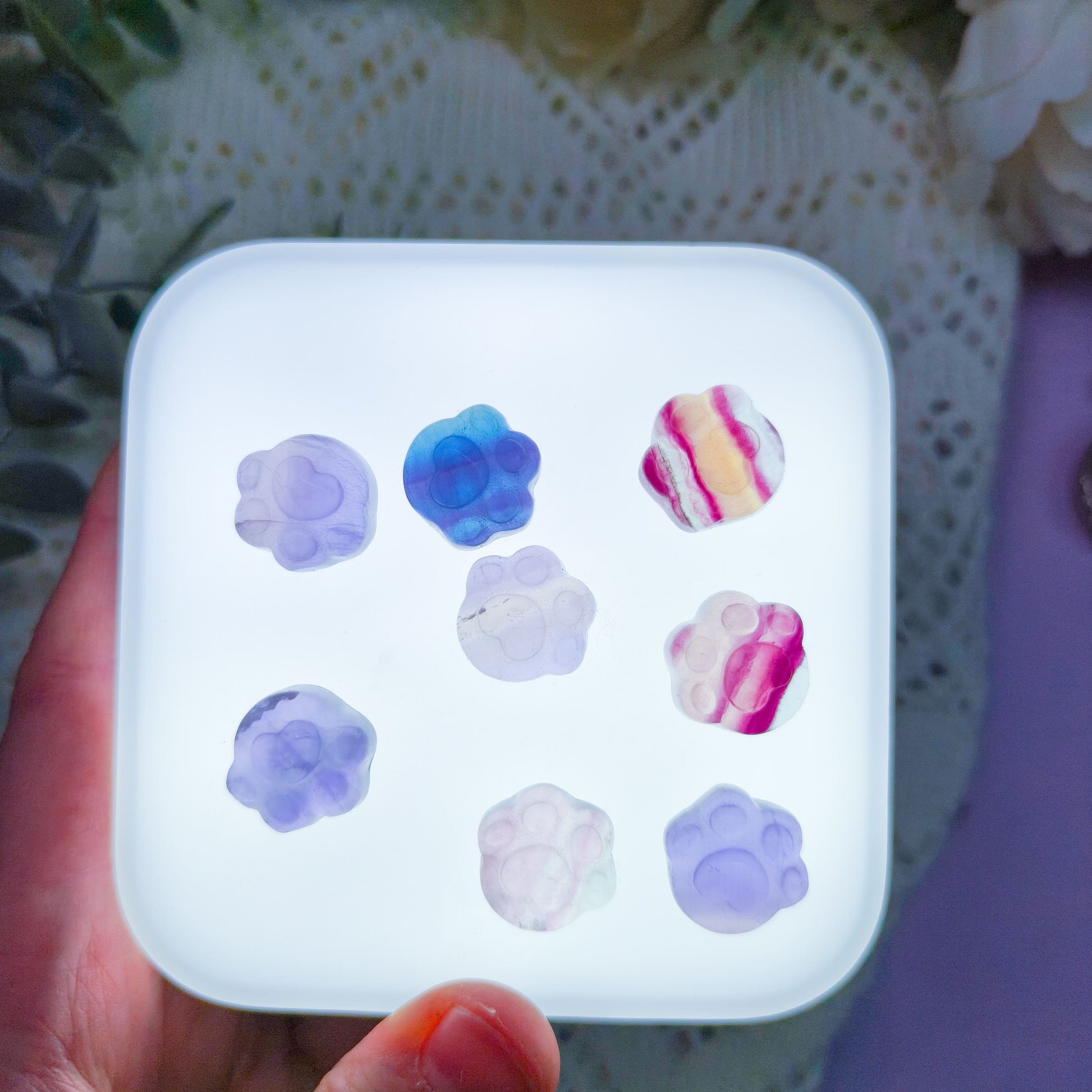 Avainsanat: fluoriitti, vihreä, lila, violetti, keltainen, oranssi, sininen, sateenkaari, kivikaiverrus, muotoon hiottu, kristalli, voimakivi, energiakivi