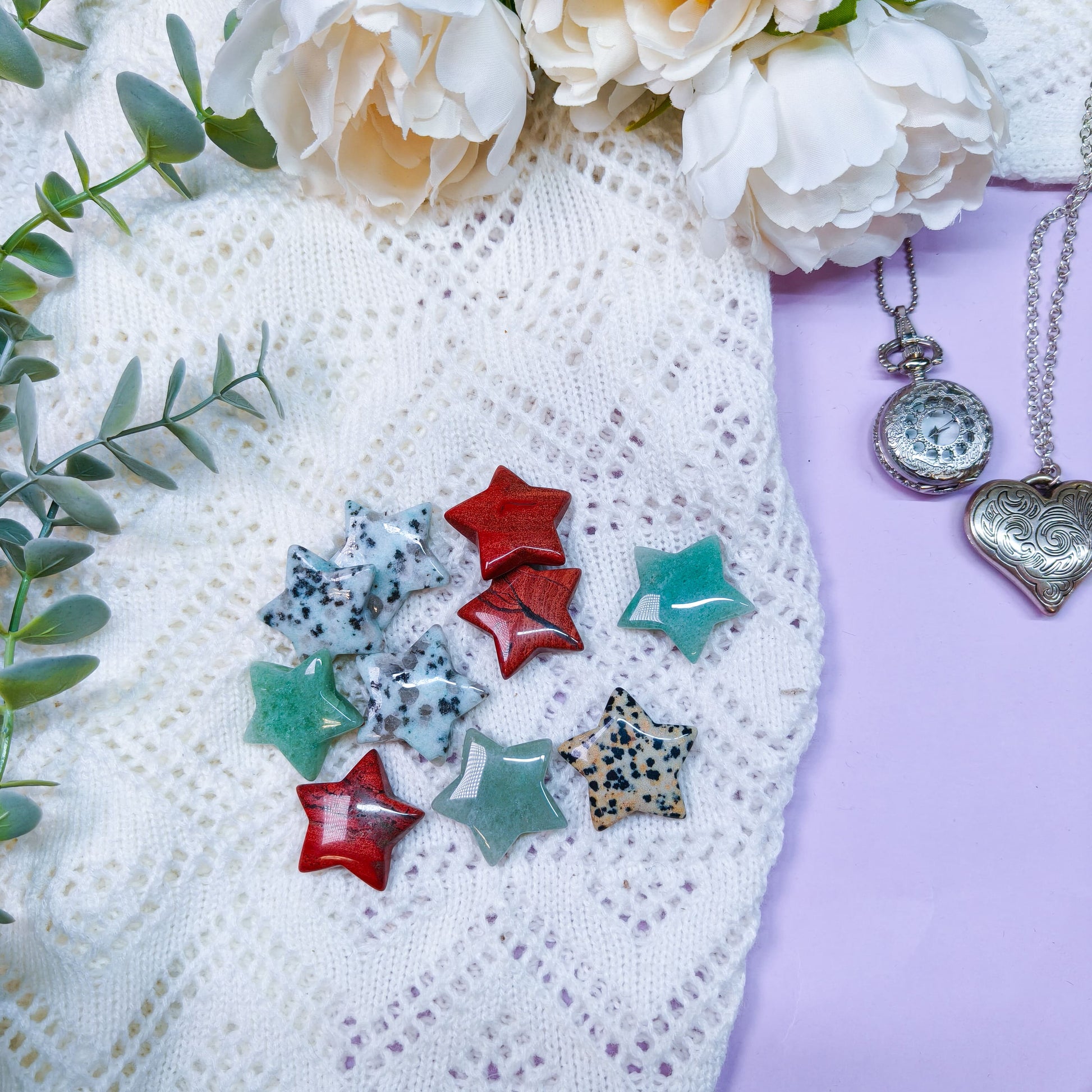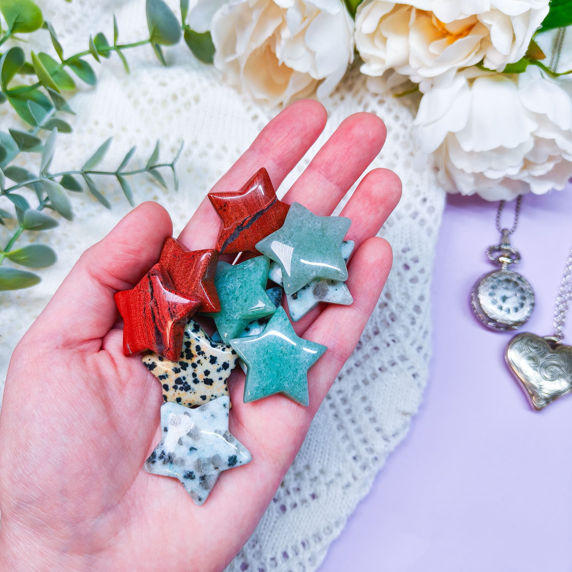 Lajitelmassa mukana mm. vihreää aventuriinia, punaista jaspista, larvikiittia, kiivijaspista ja dalmatian jaspista.