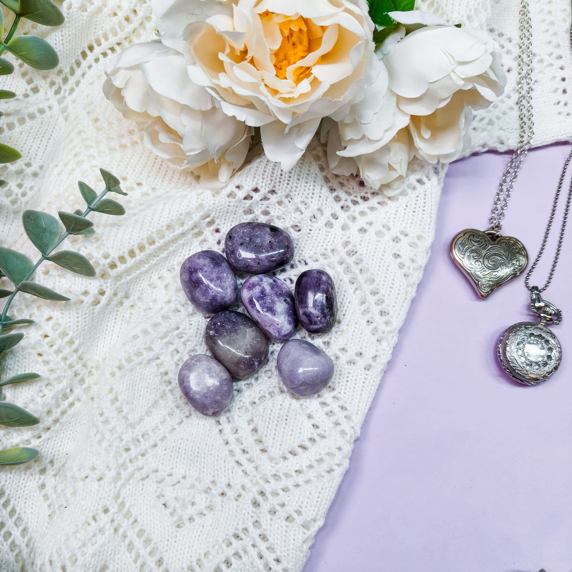 Avainsanat: lepidoliitti, lila, violetti, purppura, rumpuhiottu, kristalli, voimakivi, energiakivi