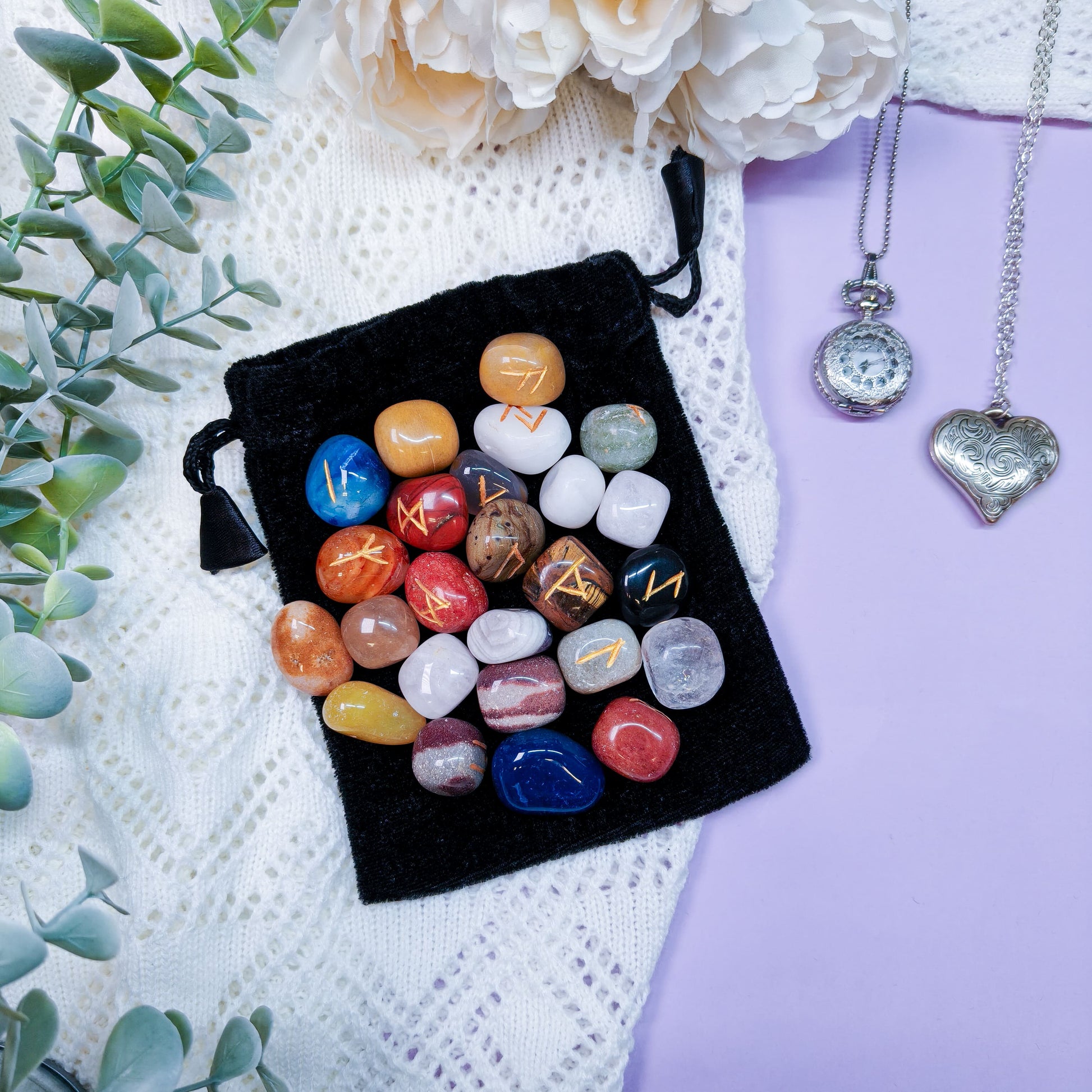 ♥ Yksi riimusetti sisältää 24 vanhan Futharkin riimua sekä yhden tyhjän kristalliriimun ja pussin niille kaikille. Kristallisekoituksessa mukana sekä luonnollisia että värjättyjä kristalleja.