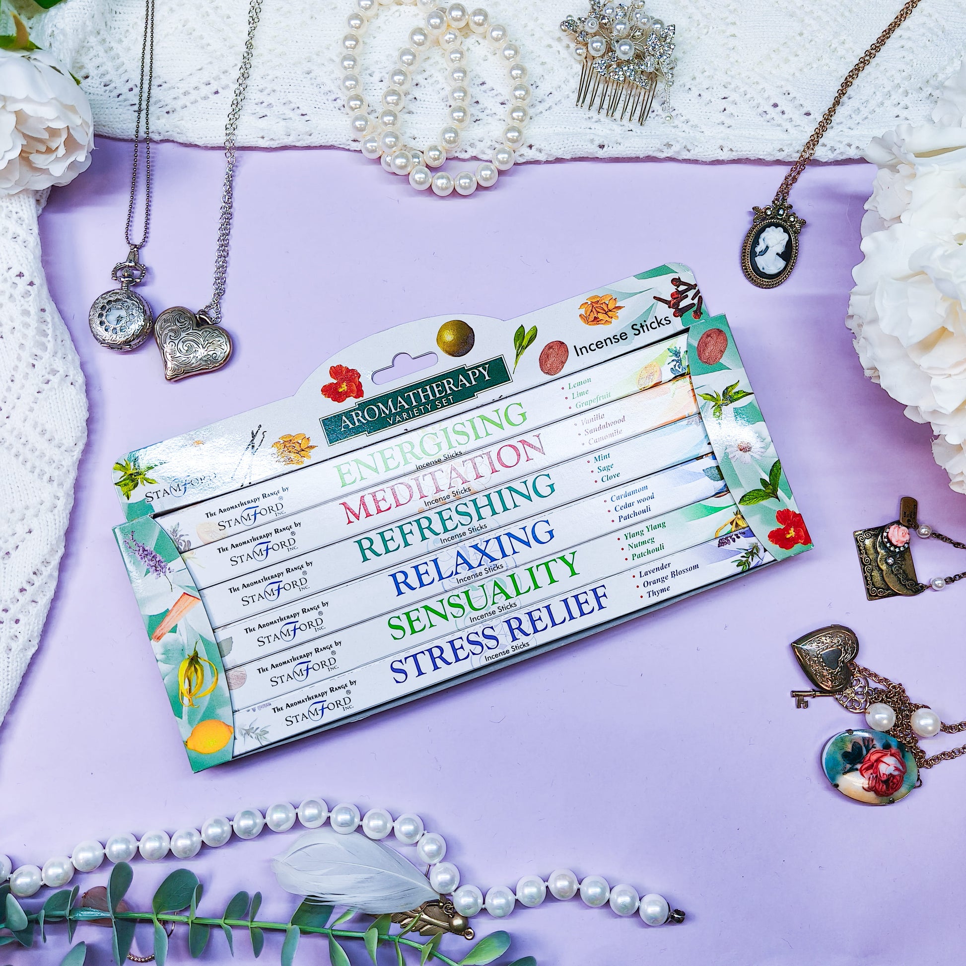 Suitsukesetti sisältää kuusi pakkausta suitsuketikkuja, jokaisessa on oma tuoksunsa.