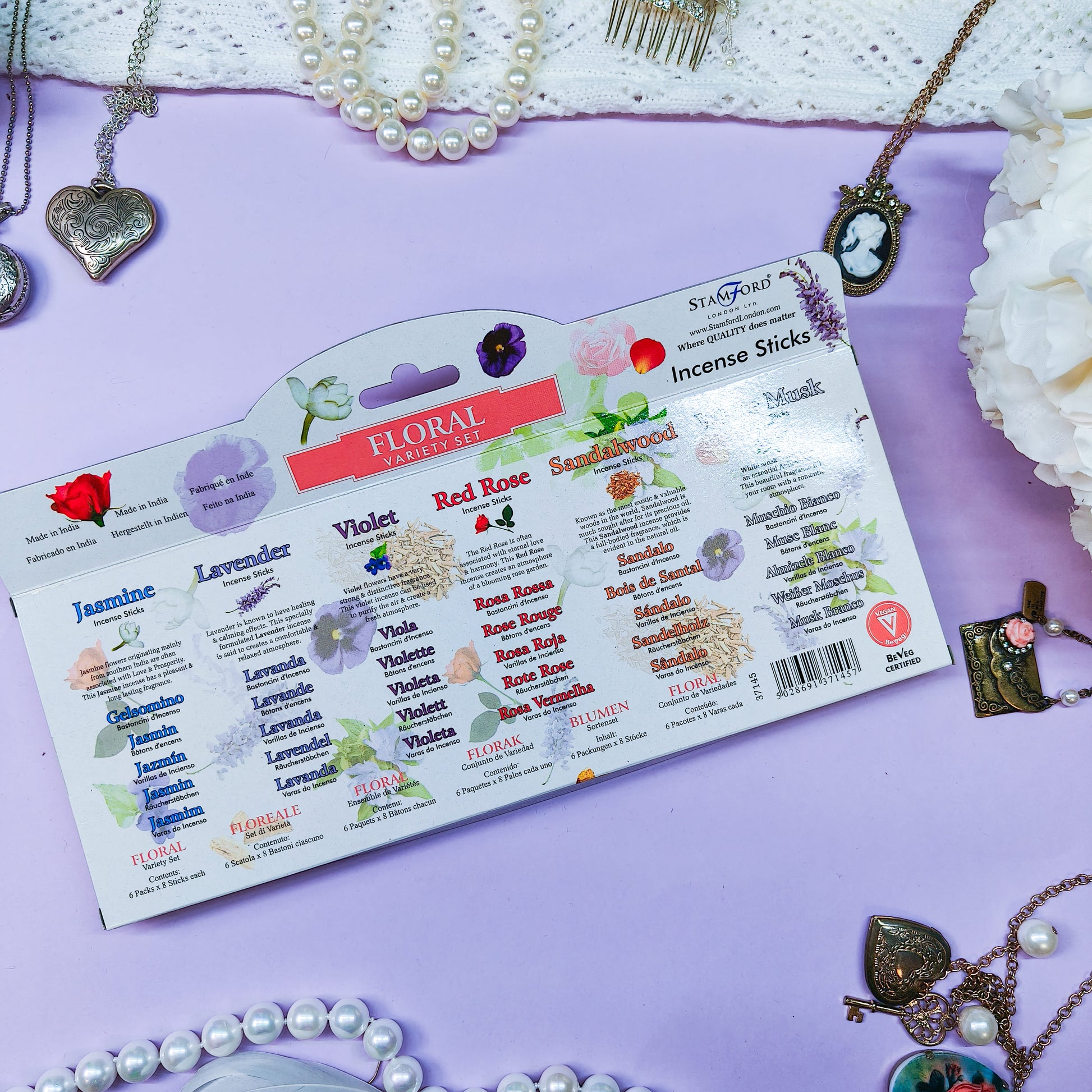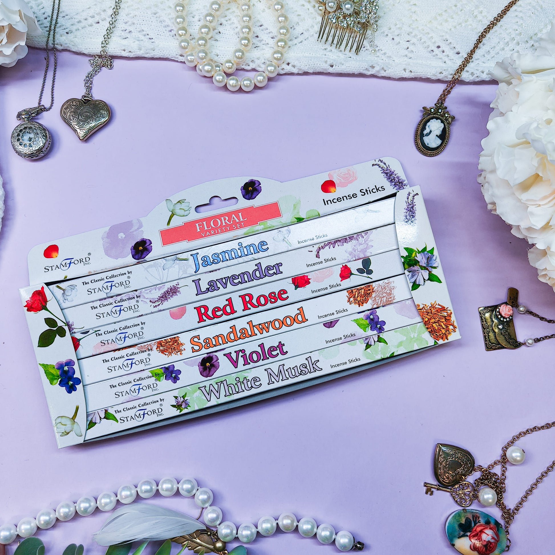 Suitsukesetti sisältää kuusi pakkausta suitsuketikkuja, jokaisessa on oma tuoksunsa.